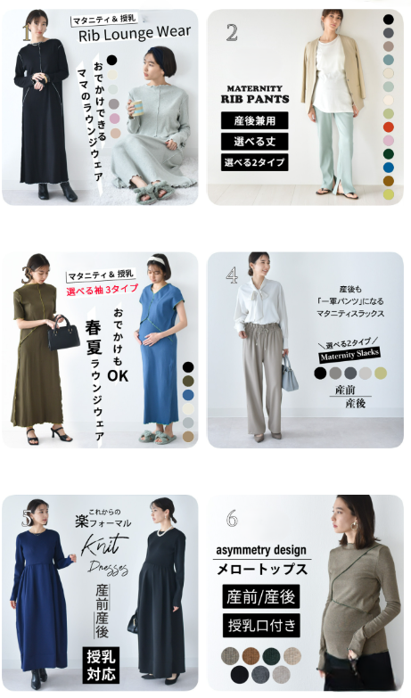 スウィートマミーのマタニティウェアは、先輩ママの声を元に多くの商品が産前産後兼用なので、妊娠中・産後も快適に着られるお洋服ばかり。